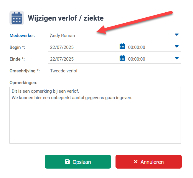 Het platform zal nog steeds automatisch de medewerker invullen die is gekozen in het bovenste luik van het venster als de medewerker voor wie we het verlof aan het ingeven zijn, maar dit kan nu aangepast worden naar een andere medewerker.